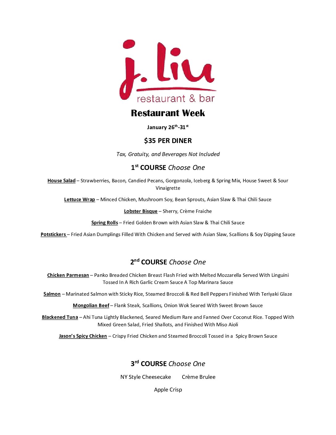 Restaurant Week is a chance for all of Columbus to get out and enjoy three course meals at new and exciting restaurants for a fraction of the price! We here at J Liu look forward to the opportunity to see some brand new faces, and of course all of our beloved local regulars. Please check our our menu that will be offered on January 26th thru the 31st!